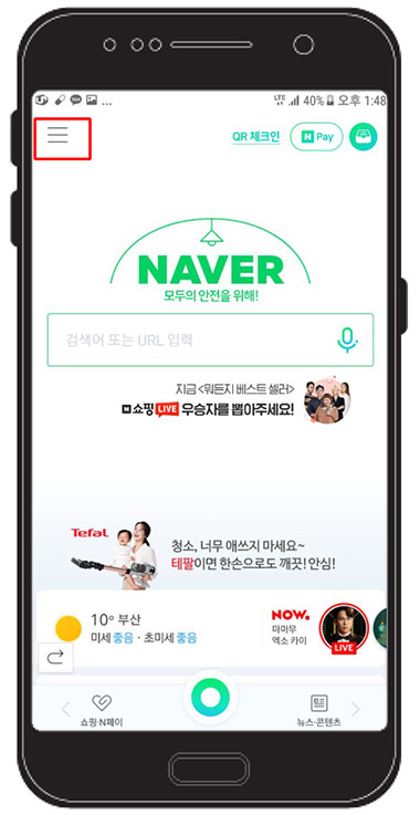휴대전화에서 네이버 어플을 실행합니다. 어플이 없다면 인터넷 브라우저로 네이버에 접속해도 됩니다.
