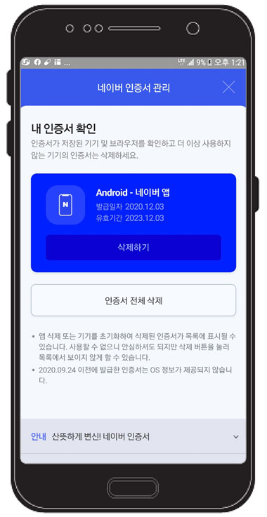 인증서 홈의 관리하기를 누르면 네이버앱으로 인증서를 발급되어진게 보이고 발급일자, 유효기간이 나옵니다.