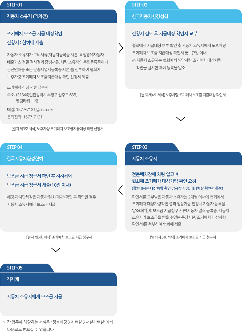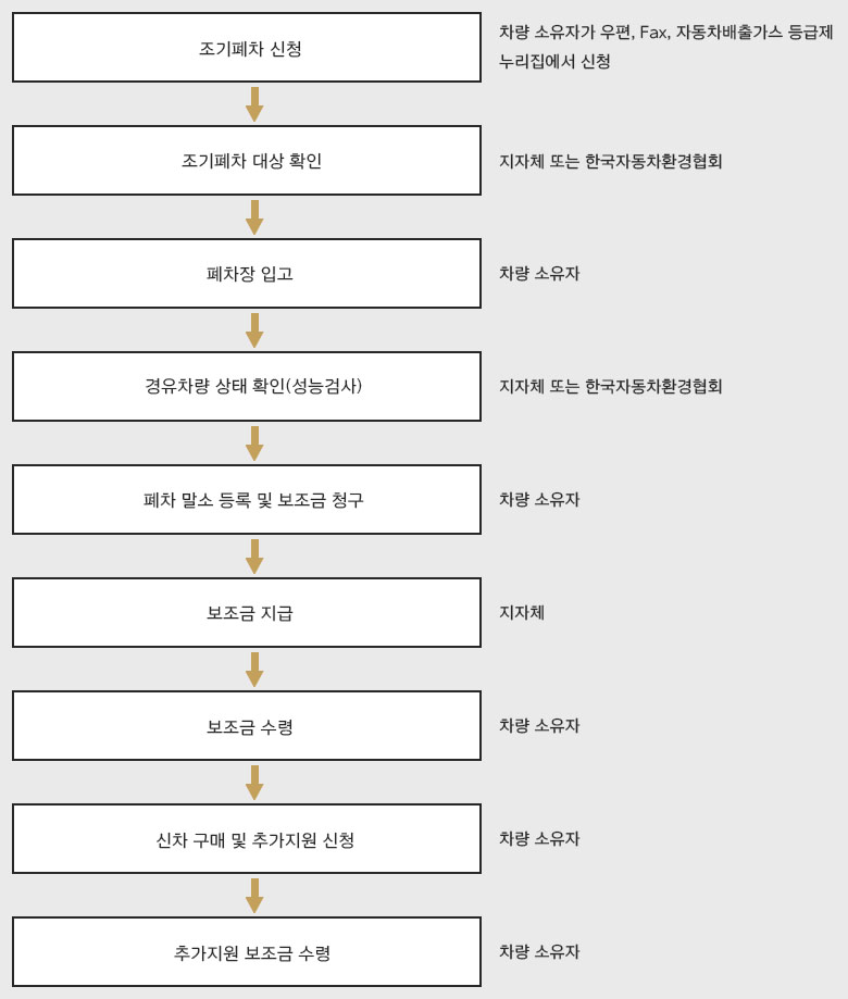 노후 자동차에서 발생하는 매연을 줄여 시민의 건강을 보호하고 쾌적한 대기환경을 조성하기를 위해 정상운행이 가능한 오래된 경유자동차를 조기에 폐차할 경우 보조금을 지원합니다. 대기관리권역에 6개월 이상 연속하여 등록된 배출가스 5등급 경유자동차 또는 2005년 이전 배출허용기준을 적용하여 제작된 도로용 3종 건설기계로 배출가스저감장치를 부착하거나 저공해 엔진으로 개조한 사실이 없고 정상가동되는 경우 그 소유자는 지자체로부터 노후차량 조기폐차 보조금 지원금을 받을 수 있습니다.