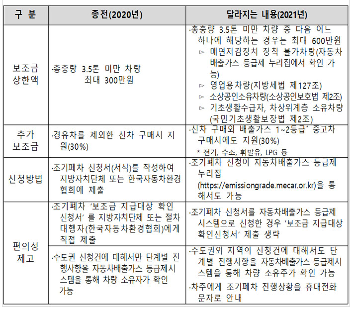 총 중량이 3.5t 미만인 배출가스 5등급 노후 경유차량 중 매연 저감장치를 장착할 수 없는 차량이나 생계형, 영업용, 소상공인 등이 소유한 차량에 대해 조기폐차 지원금 상한액을 300만원에서 600만원으로 확대했습니다.