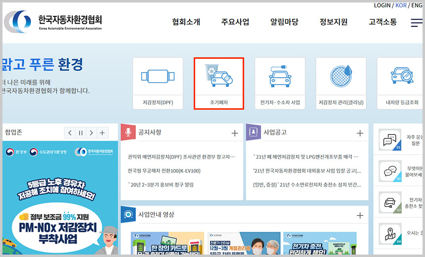 자세한 노후 경유차 조기폐차지원금 조회 및 조기폐차지원금 확인과 조기폐차 신청방법에 대해서는 한국자동차환경협회에서 알아볼 수 있다고 합니다.