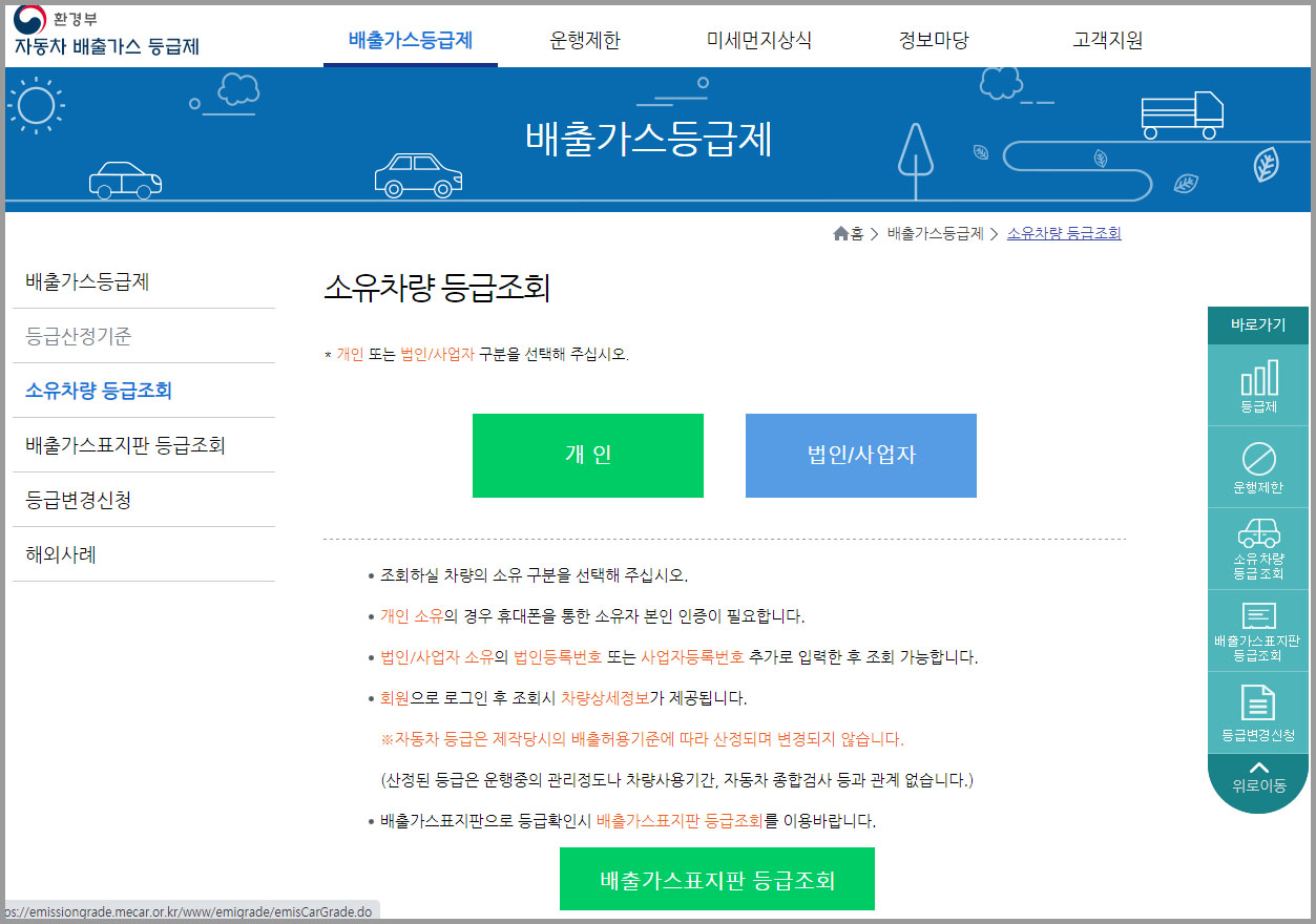 내 차가 배출가스 5등급 차량인지 아닌지는 확인하는 방법은 차동차 배출가스 등급제 홈페이지에서 조회할 수 있습니다.
