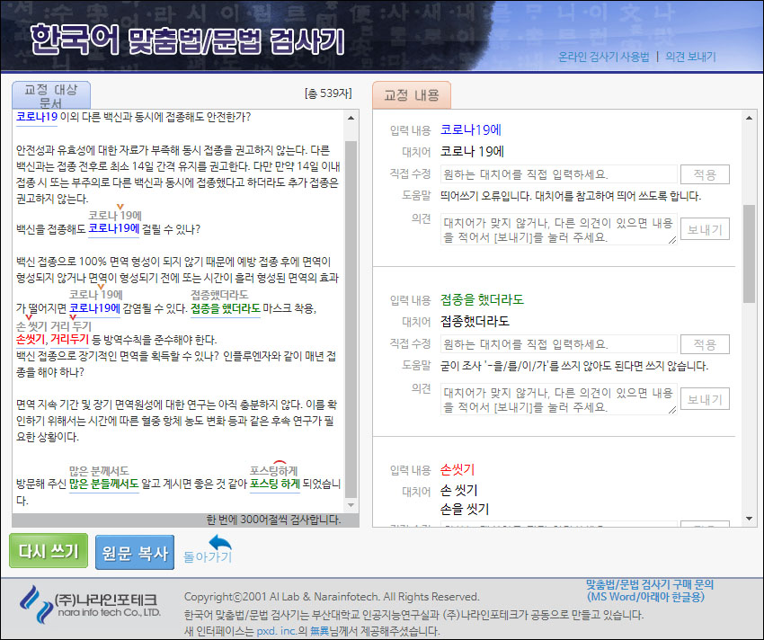 Copyrightⓒ2001 AI Lab & Narainfotech. All Rights Reserved 한국어 맞춤법/문법 검사기는 부산대학교 인공지능연구실과 (주)나라인포테크가 함께 만들고 있습니다. 이 검사기는 개인이나 학생만 무료로 사용
